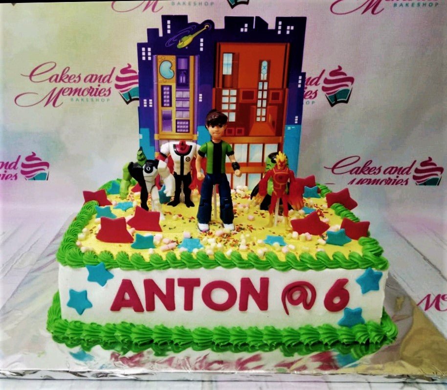 Ben 10 themed rectangle cake with green icing borders, city backdrop printout, and character toy figurines for a 6th birthday.