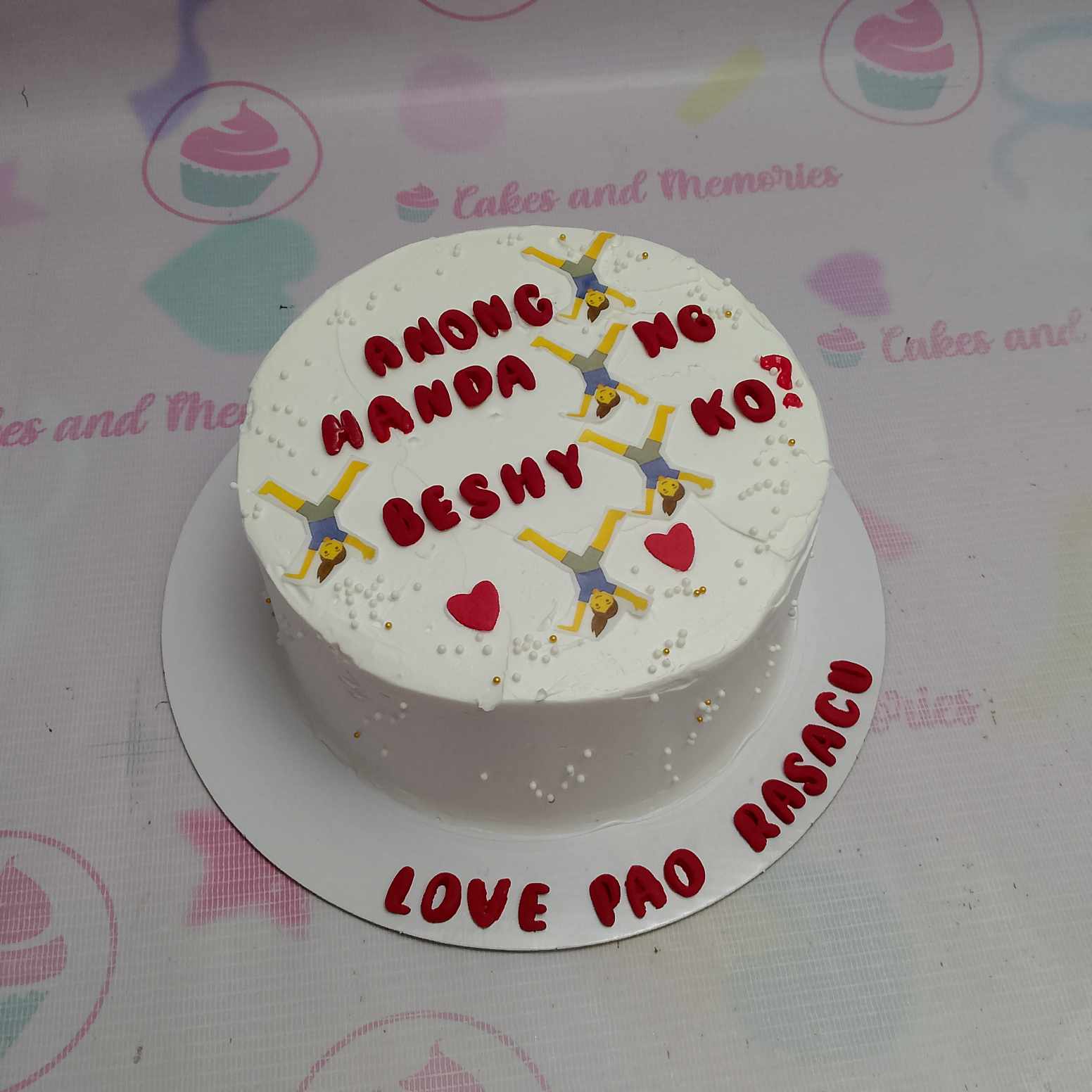 White minimalist cake with red icing text and printout toppers of a person doing a handstand with red hearts and gold sprinkles.