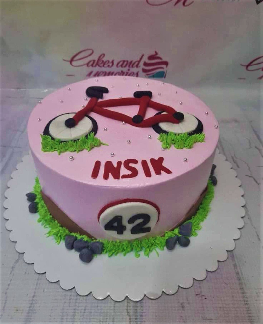 Pink bicycle themed birthday cake with a red fondant bike, green icing grass, and silver dragees.