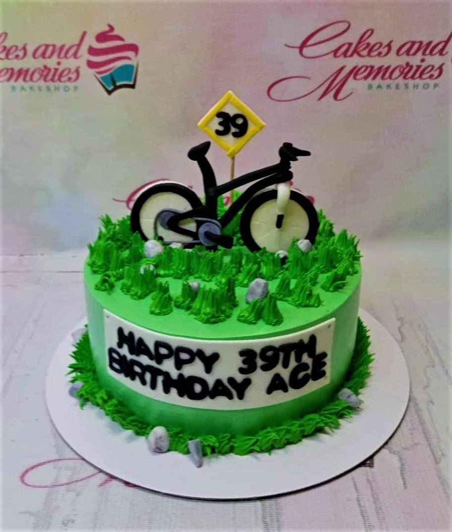 Green bicycle themed birthday cake with grass-like icing, a black bike topper, and a yellow road sign for a 39th birthday.