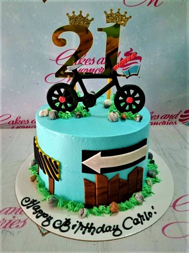 Light blue 21st birthday cake with a black bicycle topper, gold glitter numbers, and a green grass border with fondant stones.