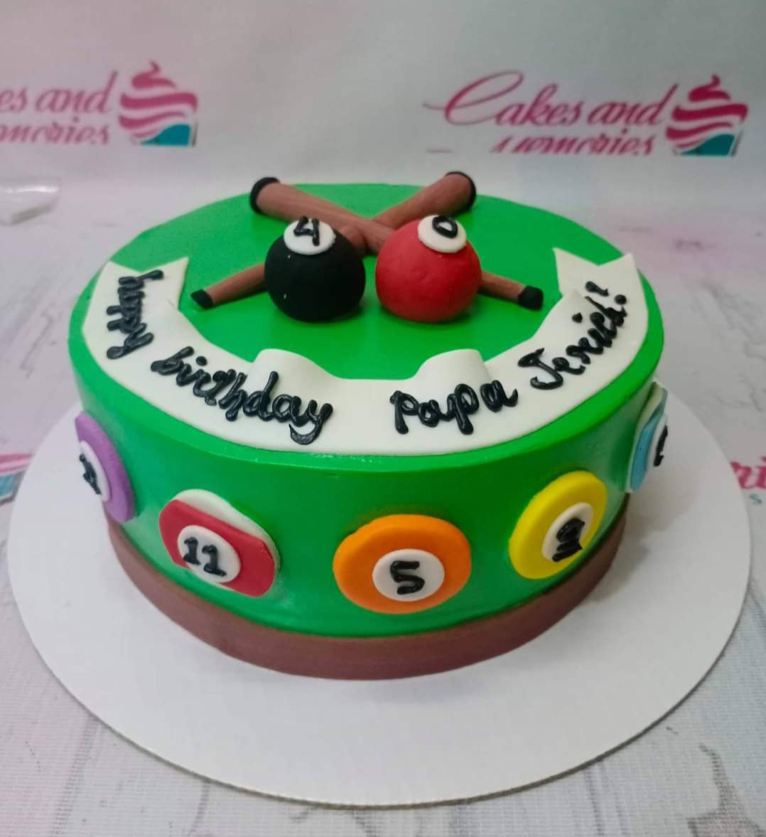 Green billiard themed birthday cake with fondant pool balls, cue sticks, and a white banner message for Papa Jerick.