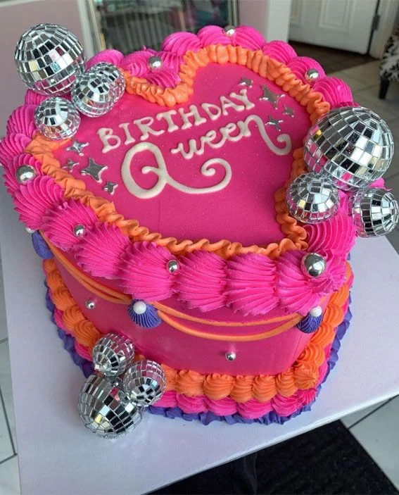 Heart-shaped hot pink cake with orange and purple ruffles, silver disco balls, and 'Birthday Queen' message.