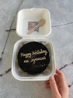 Black bento cake with gold glitter and gold icing text Happy Birthday in a white container with wooden cutlery.