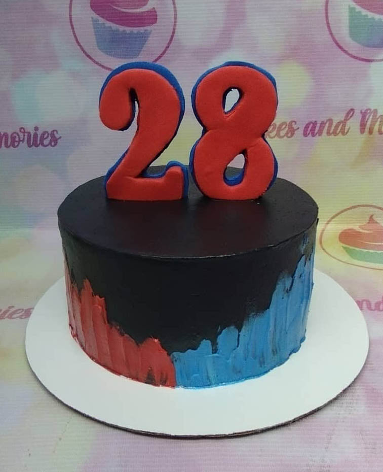 Black minimalist cake with red and blue palette knife icing textures and a large red number 28 topper.