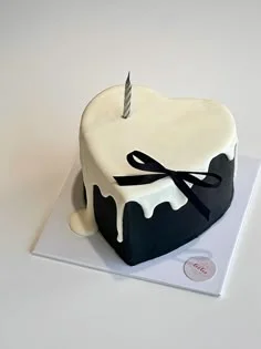 Heart-shaped black fondant cake with white icing drip, a black ribbon bow, and a single silver candle.
