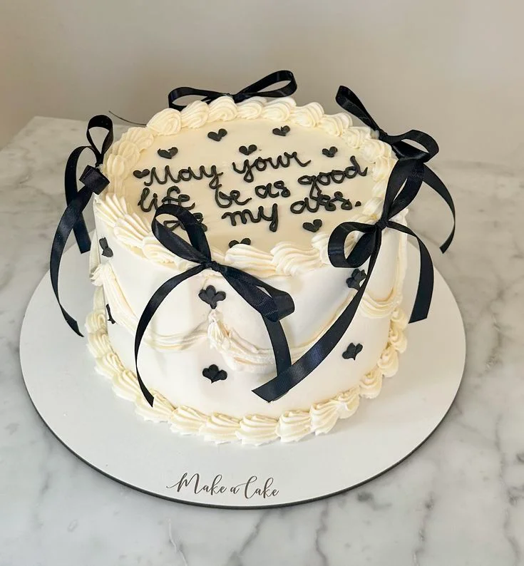 White minimalist cake with black piped message and black satin ribbons on a white base board.