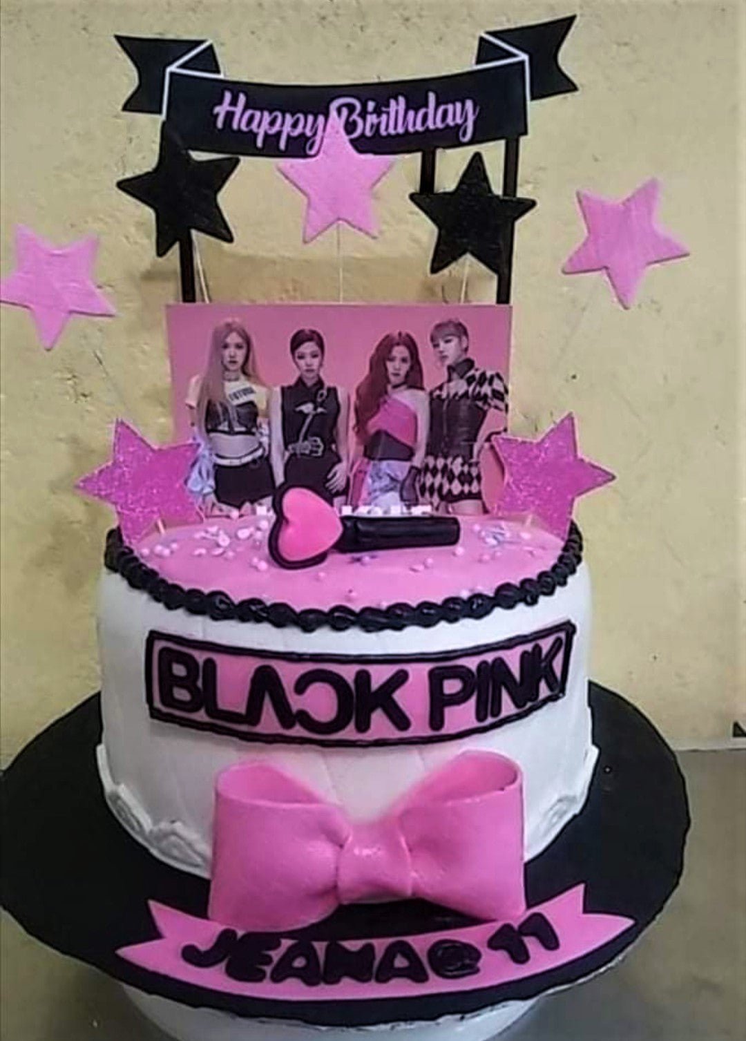 Blackpink themed birthday cake with pink and black stars, a group photo printout, and a large pink fondant bow.