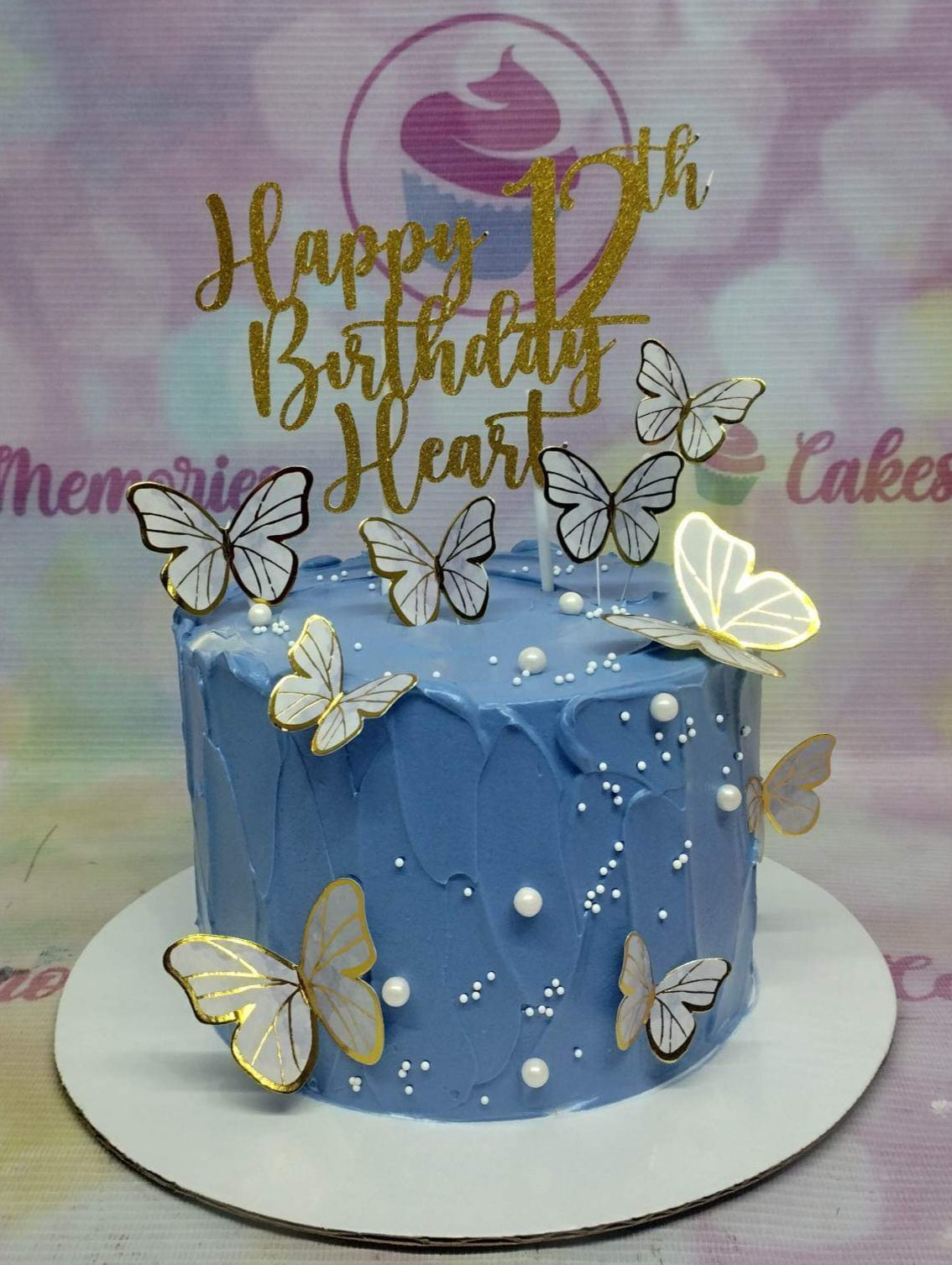 A tall 1-tier blue cake with textured soft icing, gold-edged white butterfly printouts, and white pearl sprinkles.