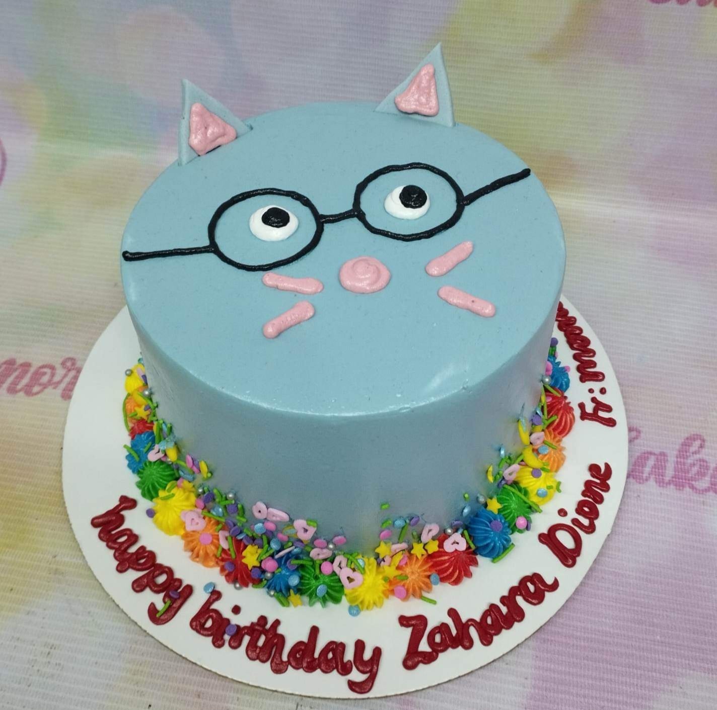 Light blue cat-themed birthday cake with piped glasses, ears, and colorful icing rosettes at the base.