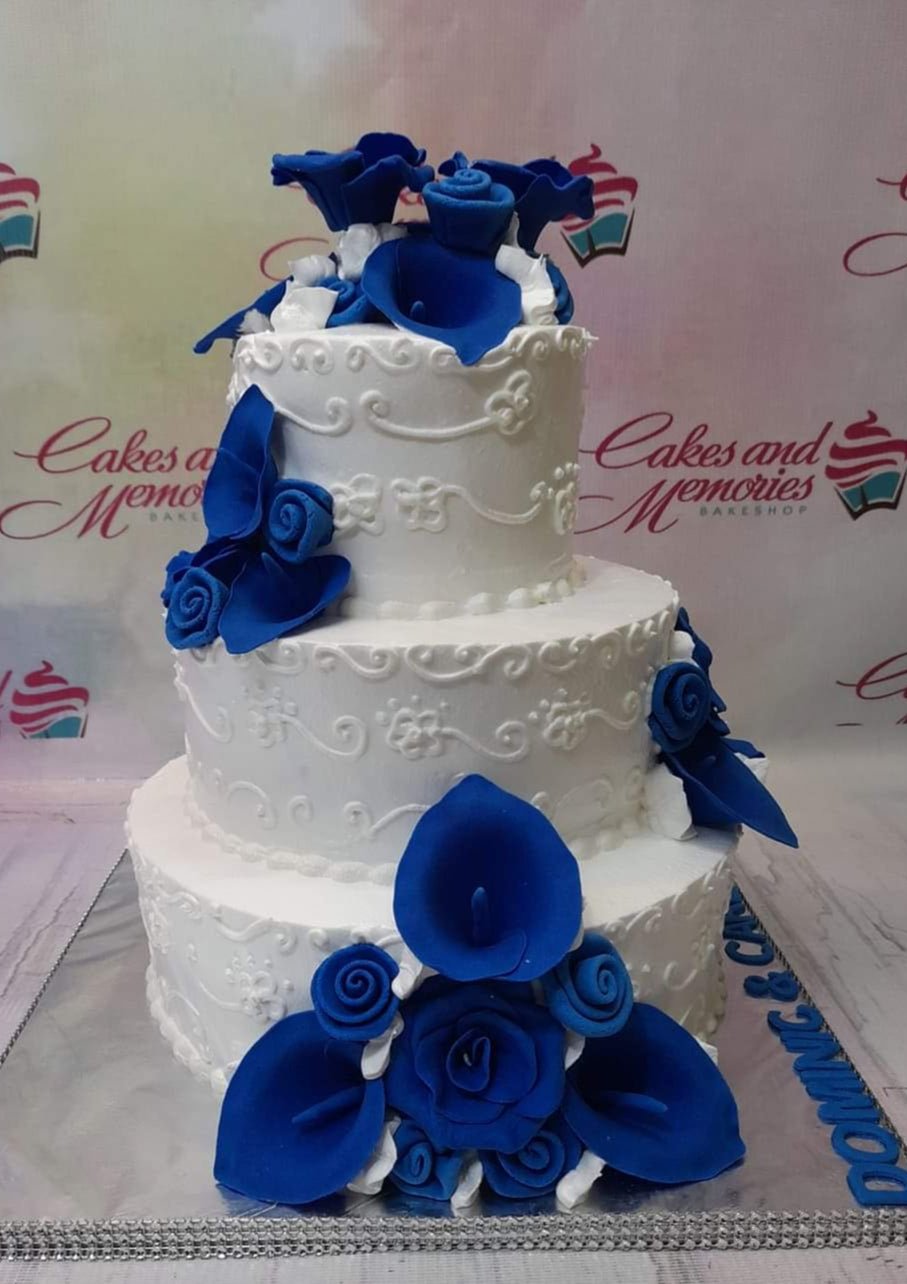 Elegant 3-tier white cake with intricate white icing swirls and vibrant blue gumpaste calla lilies and roses.