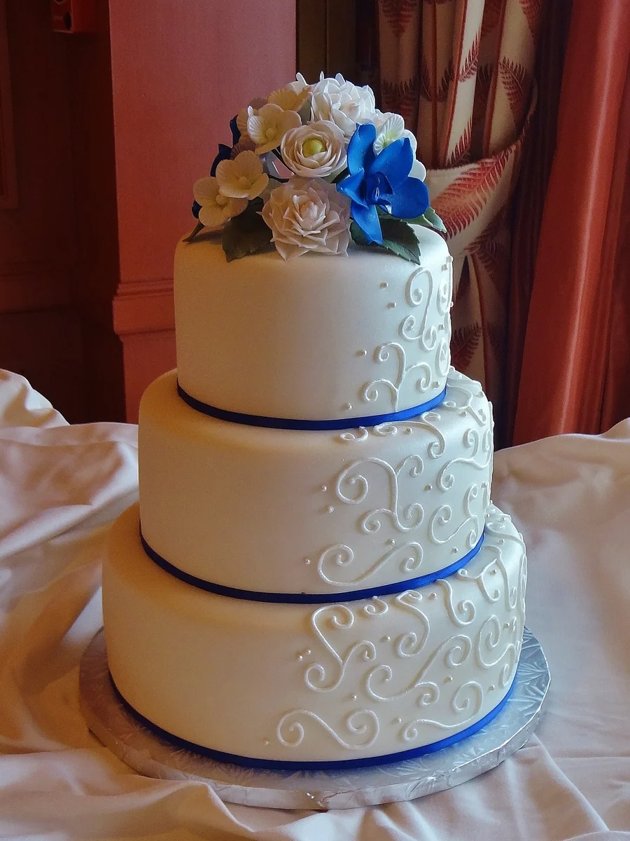 Elegant 3-tier white fondant wedding cake with blue and white sugar flowers and intricate white royal icing scrollwork.
