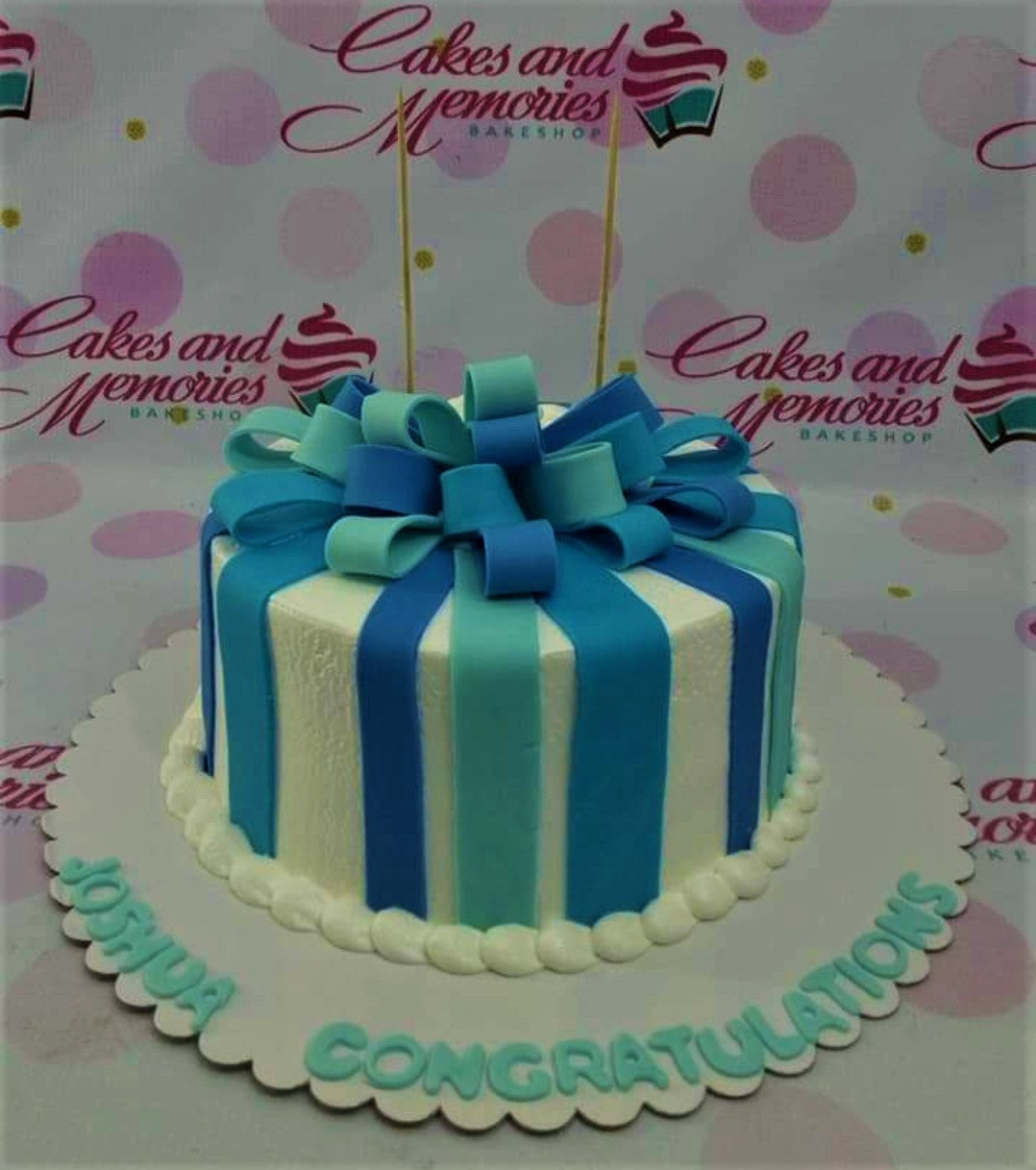 White round cake with blue and teal vertical fondant stripes and a large multi-colored fondant bow on top.