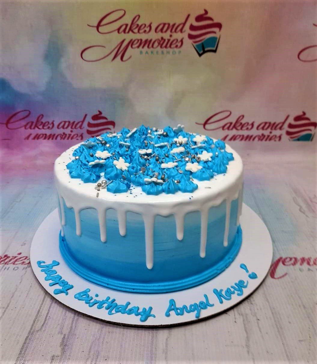 Blue gradient 1-tier birthday cake with white drip, blue icing rosettes, and silver sprinkles for Angel Kaye.