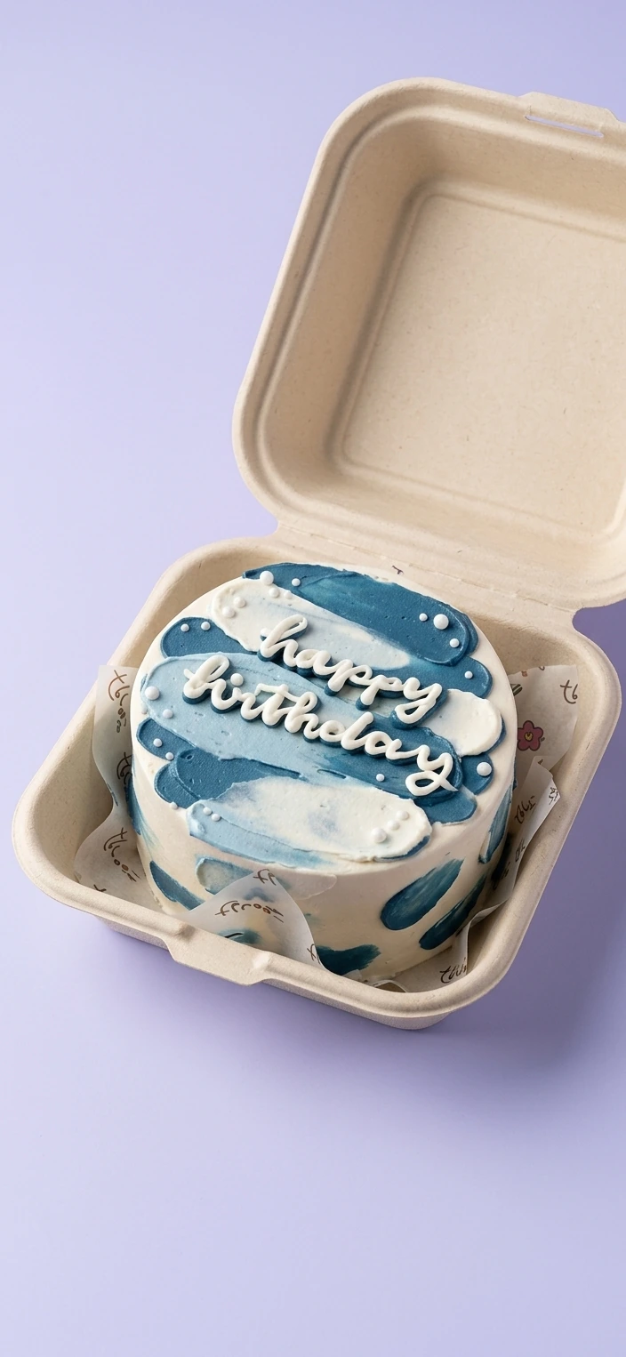 Bento cake with blue and white palette knife icing strokes and white piped Happy Birthday message in a clamshell box.