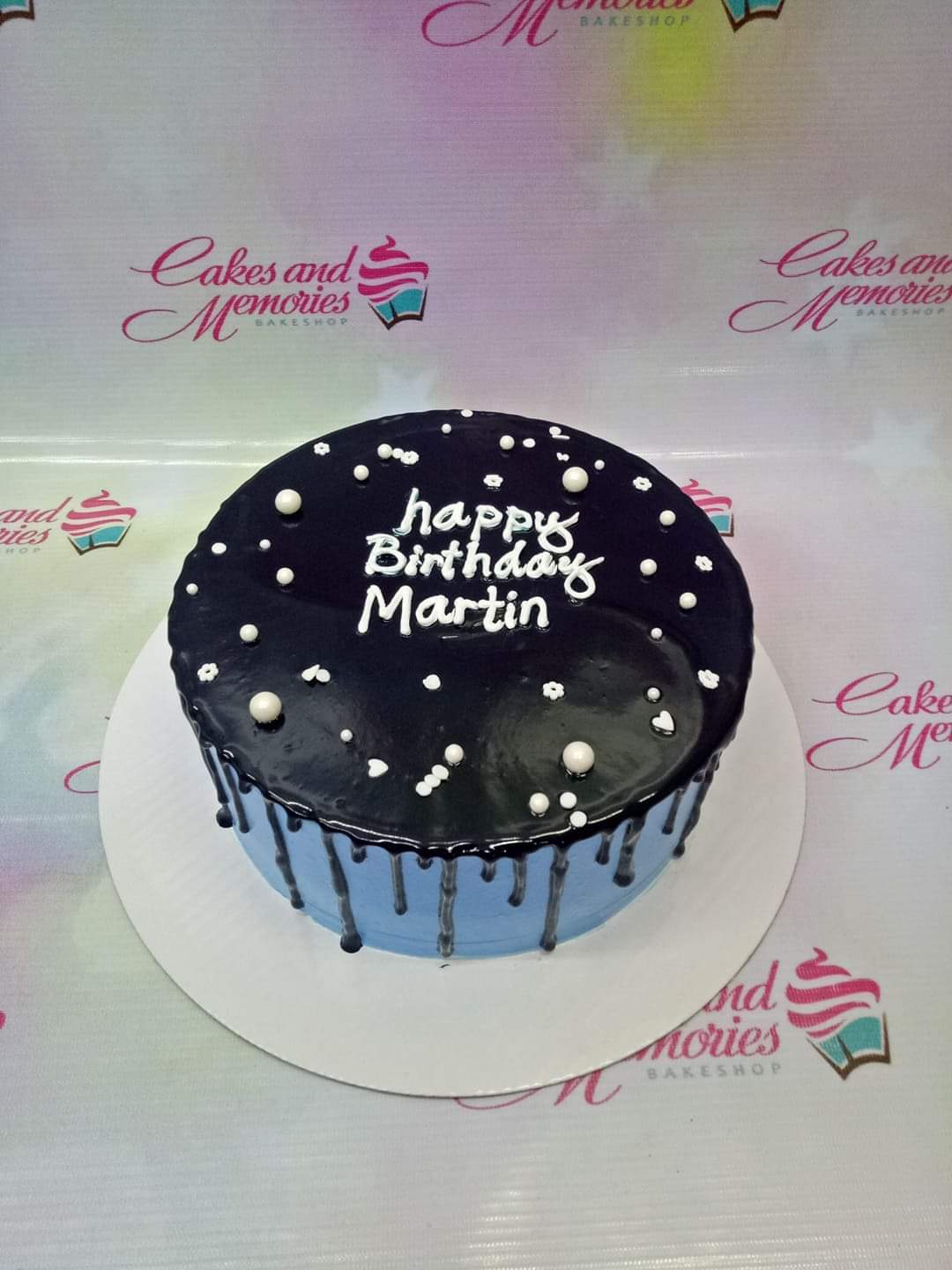 Light blue birthday cake with black chocolate drip, white icing message, and pearl sprinkles.