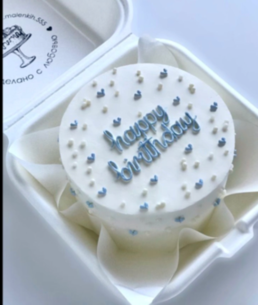 White bento cake with blue and white heart sprinkles and blue piped Happy Birthday message in a clamshell box.