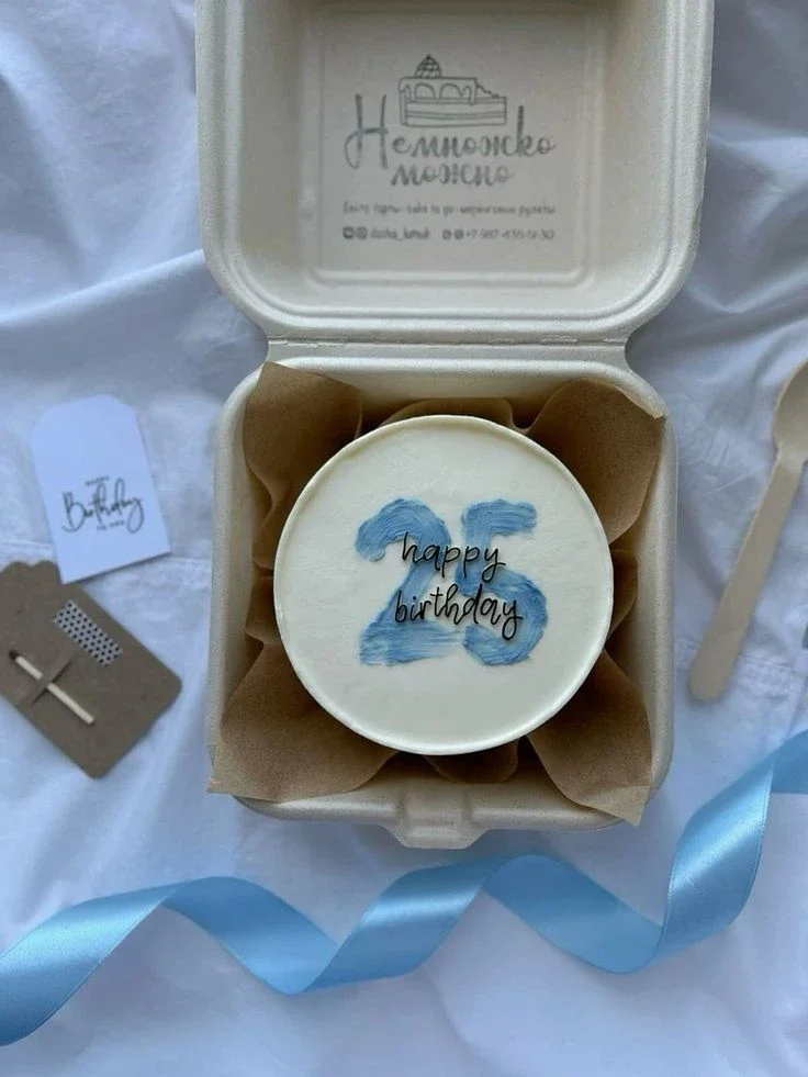 White bento cake with a blue palette knife number 25 and happy birthday message in a clamshell box.