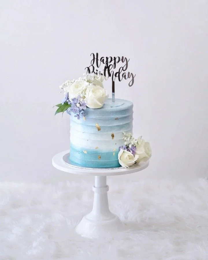 A tall single-tier birthday cake with blue and white ombre icing, decorated with white roses, lavender flowers, and gold leaf accents.