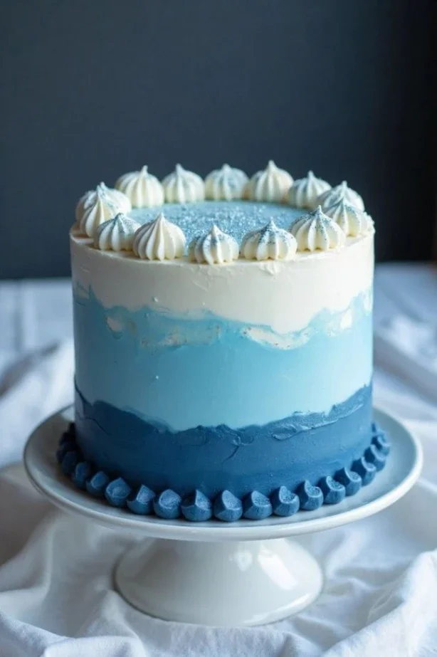 A tall single-tier cake with blue ombre icing, white meringue kisses on top, and a blue piped border at the base.