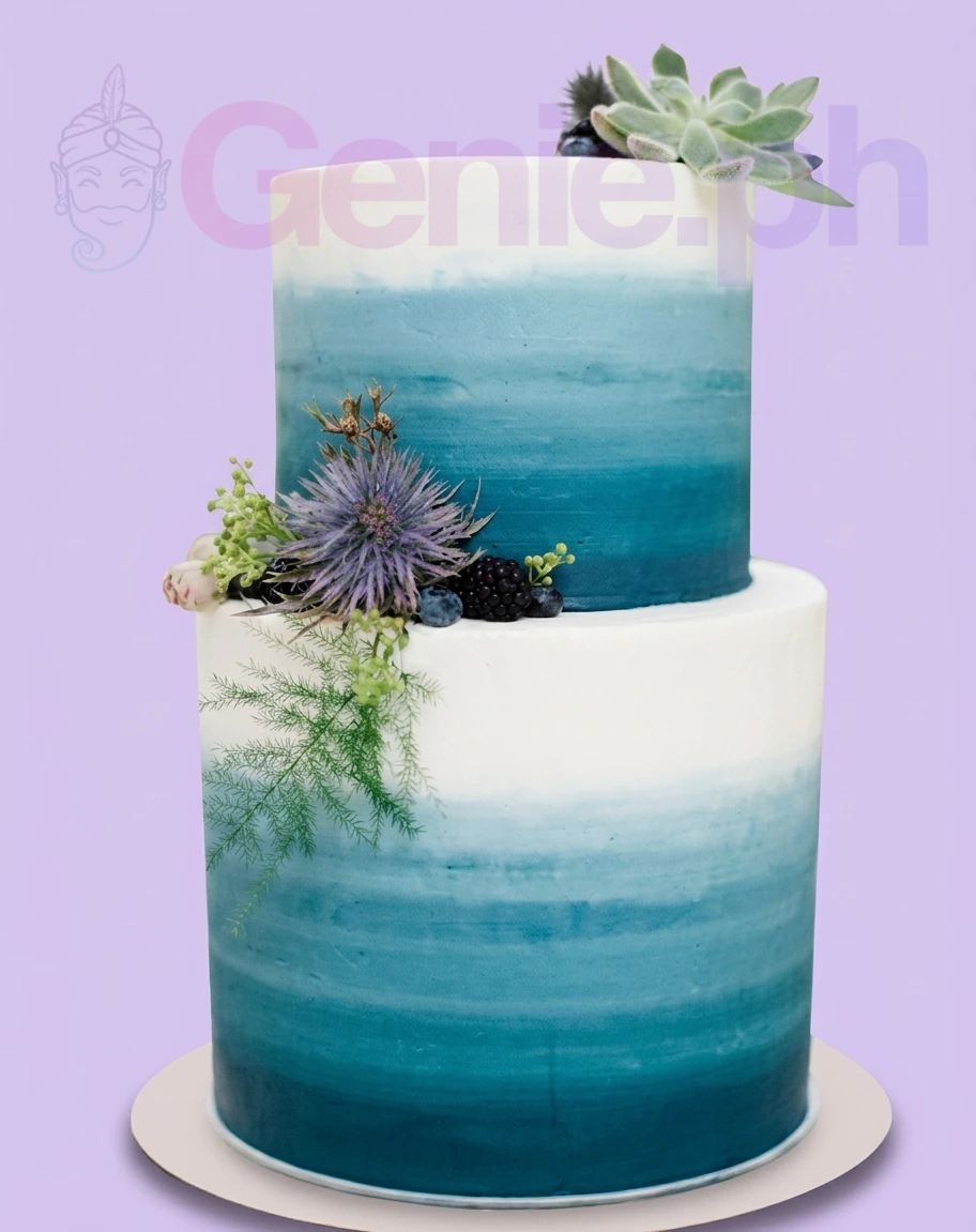 Two-tier ombre blue and white cake decorated with fresh succulents, thistles, and berries.