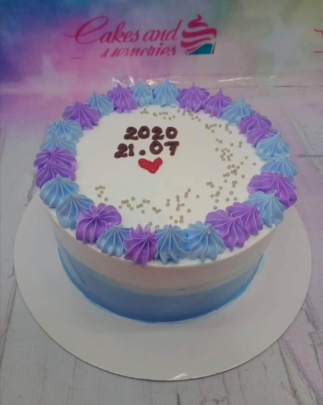 This elegant 1-tier minimalist birthday cake features a beautiful white to blue gradient icing finish. The top is adorned with a vibrant border of alternating purple and light blue icing rosettes, creating a playful yet sophisticated look. Scattered silver dragees add a touch of sparkle across the white surface. The cake is personalized with a hand-piped date and a small red heart message. This design is perfect for celebrating anniversaries or special milestones with loved ones. Order your custom celebration cake today through Genie.ph for delivery in Cebu City, Mandaue, or Lapu-lapu City.