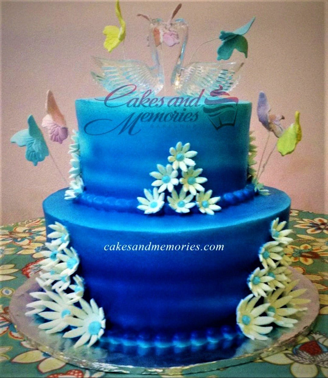Two-tier blue gradient fondant cake decorated with white daisies and colorful butterfly toppers, featuring a glass swan topper on top.