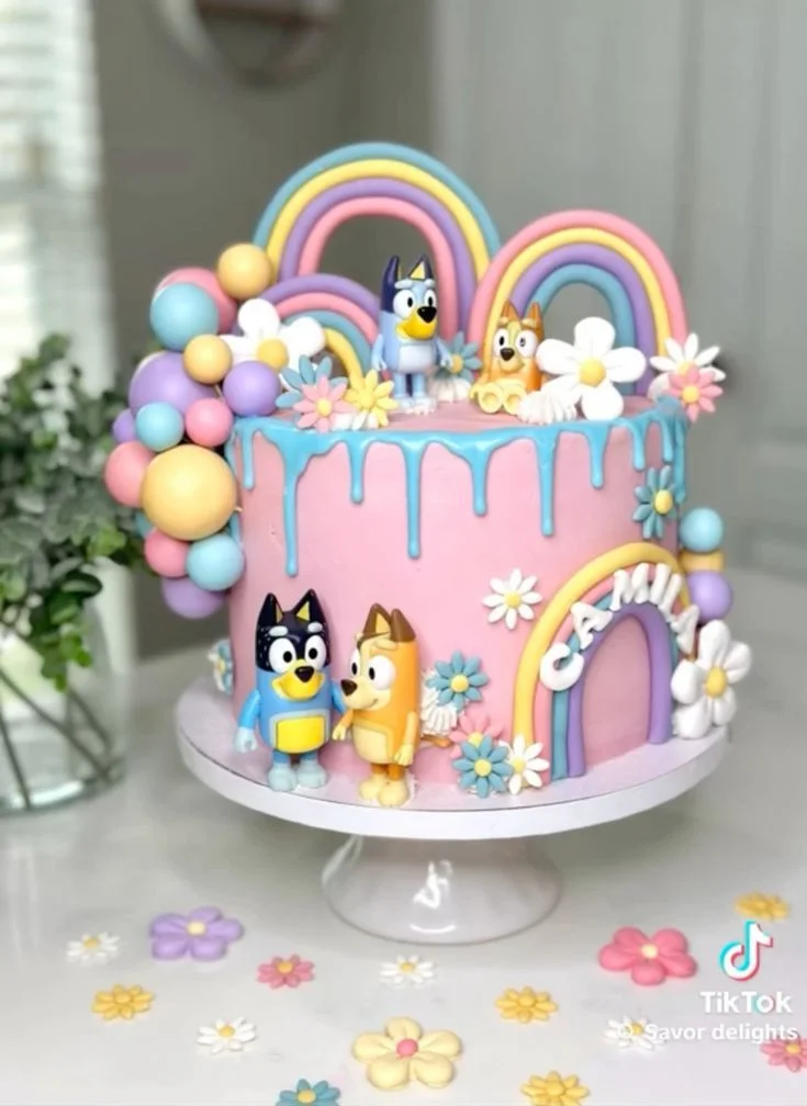 Pink Bluey themed birthday cake with 3D fondant characters, rainbows, and colorful balloon-like spheres.