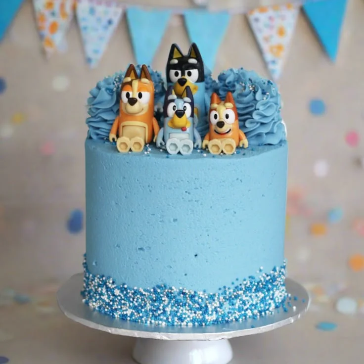 Bluey themed light blue birthday cake with 3D character figures and blue and white sprinkles at the base.