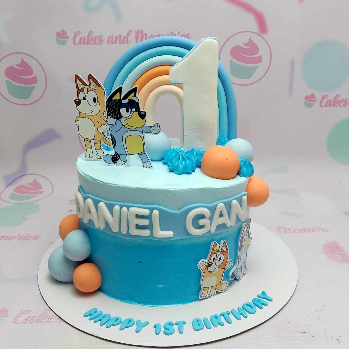 Bluey themed 1-tier birthday cake with a blue gradient icing, fondant rainbow, and character printouts for Daniel Gan's 1st birthday.