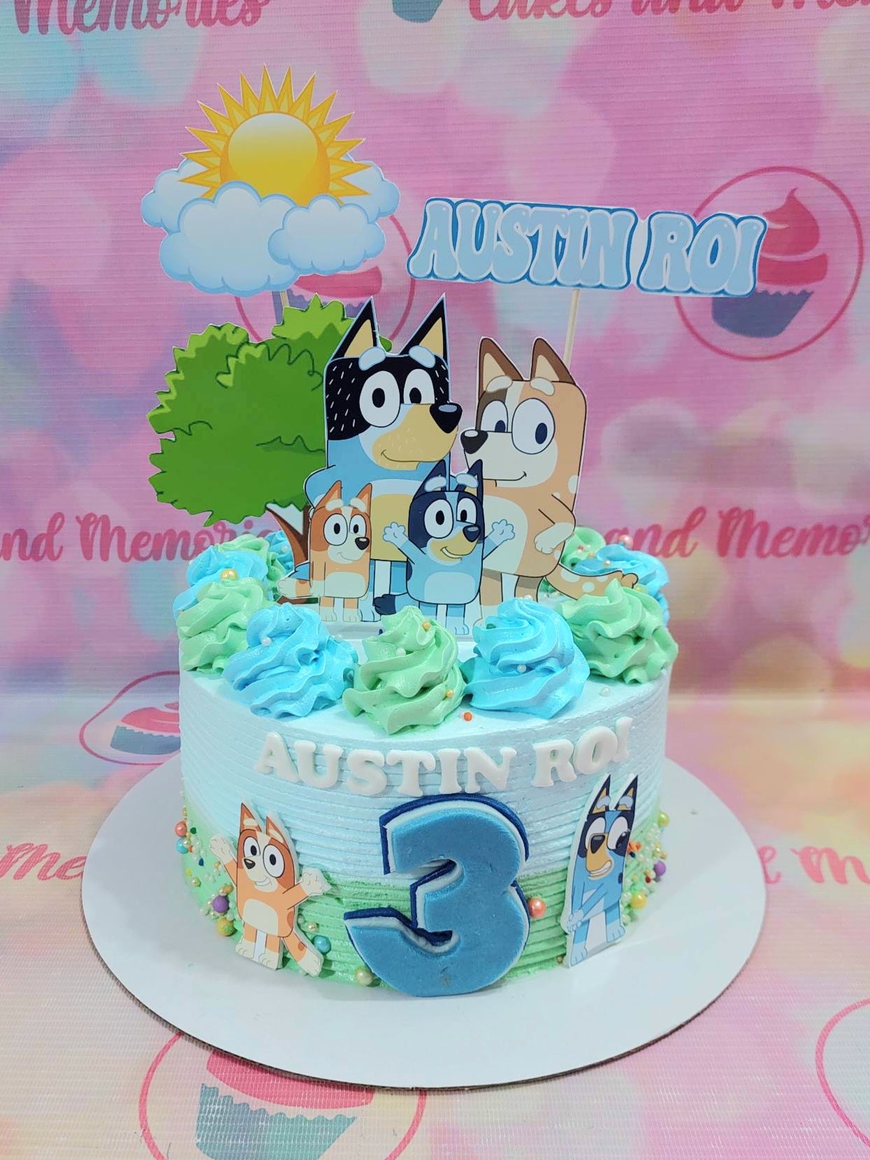 Bluey themed birthday cake with light blue and green gradient icing, character printouts, and a large blue number 3.