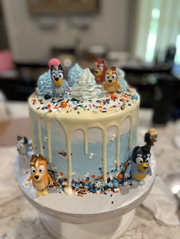 Bluey themed birthday cake with light blue ombre icing, white chocolate drip, and plastic character figurines.