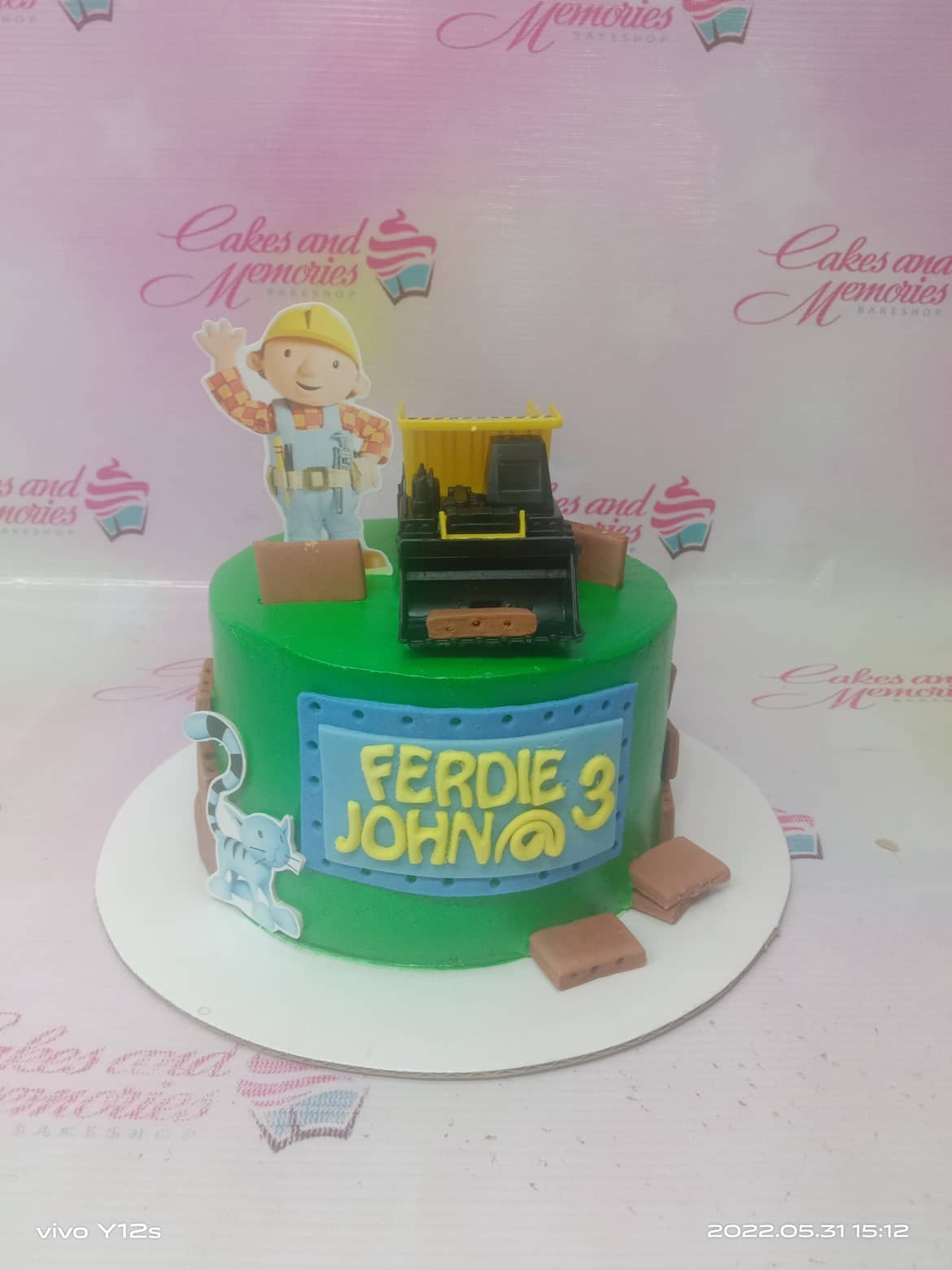 Green Bob the Builder themed birthday cake with a toy construction truck and fondant brick decorations.