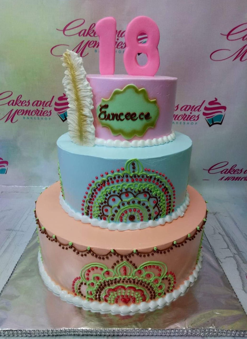 Three-tier boho-inspired birthday cake in pink, blue, and peach with intricate henna-style icing patterns and a large pink number 18 topper.