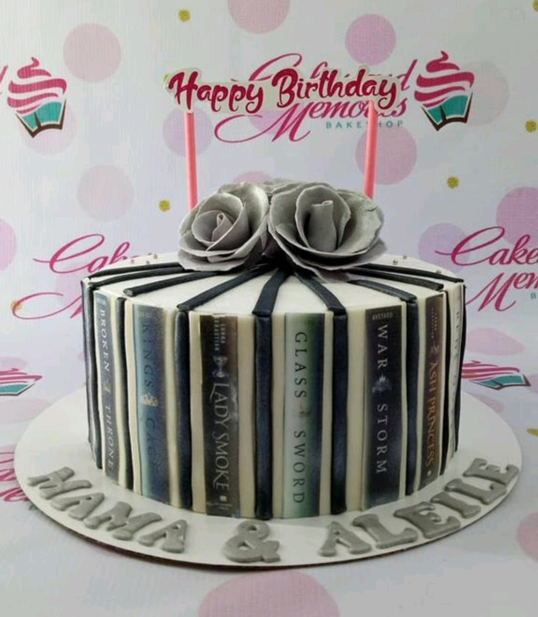 White fondant book-themed cake with edible book spine panels, grey sugar roses, and a Happy Birthday topper.