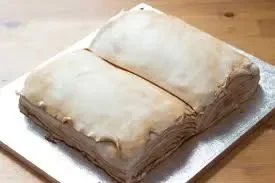 A rectangular cake shaped like an open book with textured white icing and brown accents on the edges.