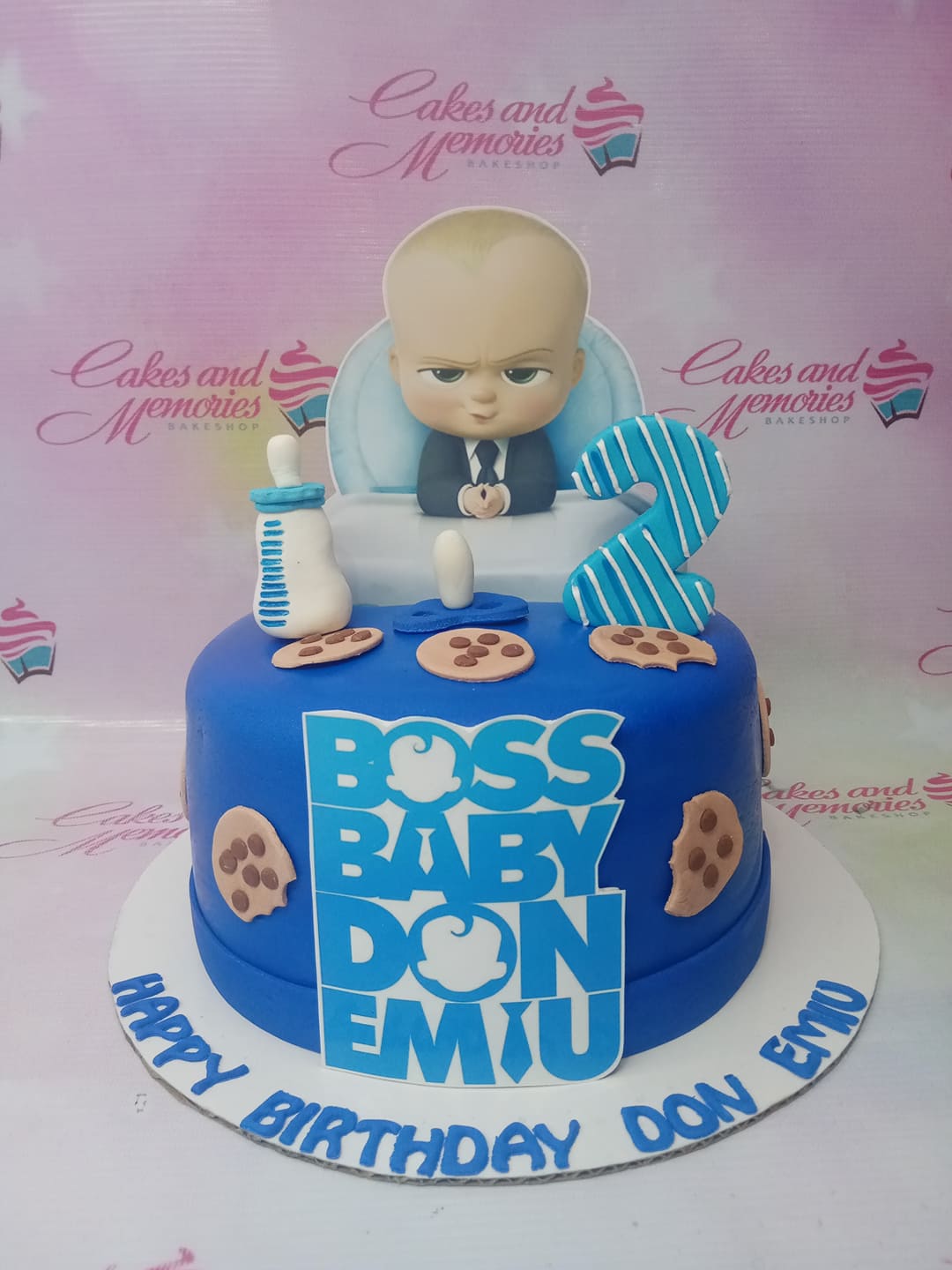 Blue Boss Baby themed fondant cake with a 3D baby figure, cookies, and a blue number two topper.