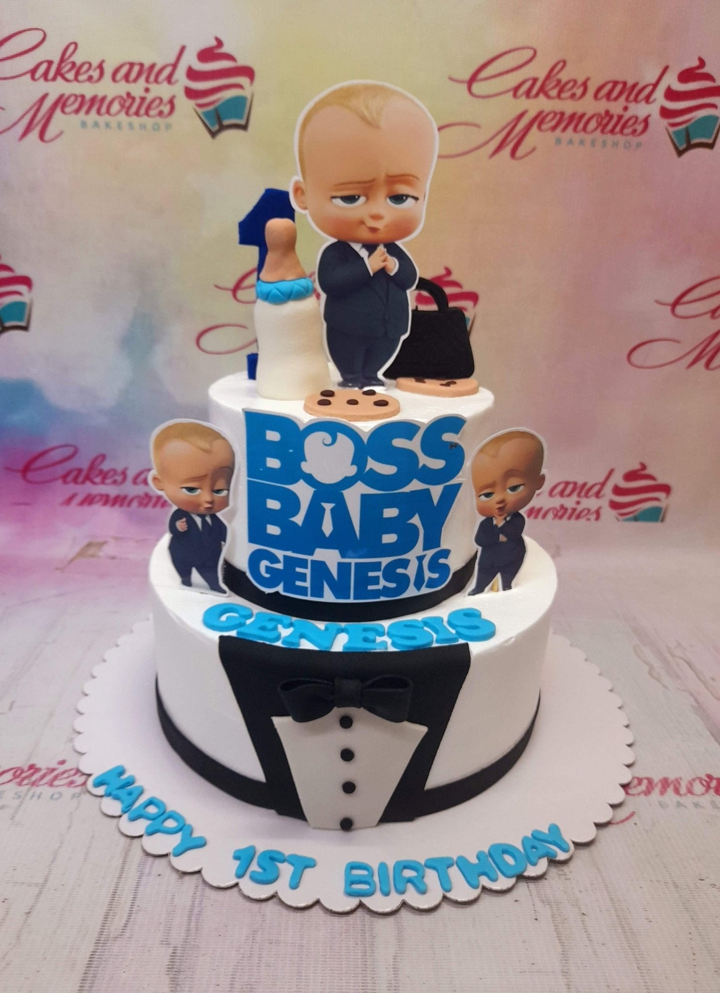 Two-tier Boss Baby themed birthday cake in white and blue with tuxedo design and character printouts.