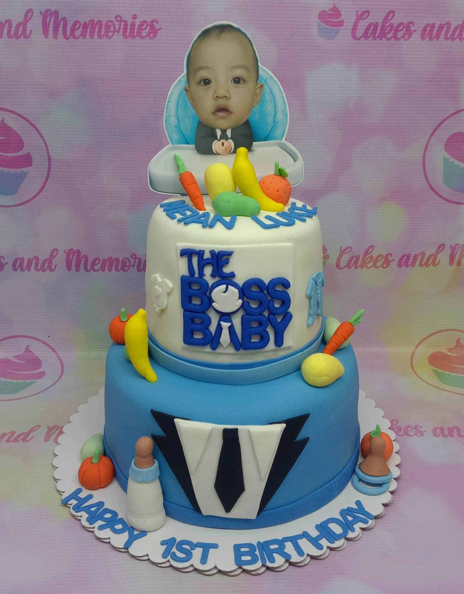 Two-tier blue and white Boss Baby themed cake with a photo printout of a baby, fondant fruits, and a tuxedo design.