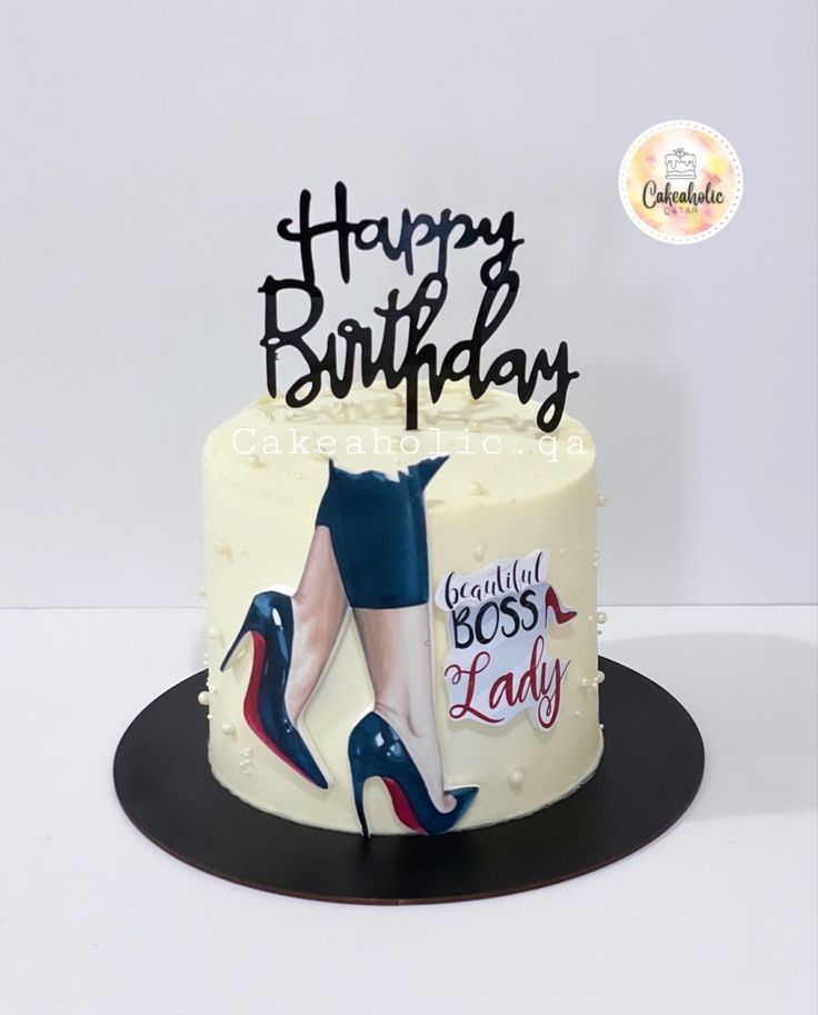 White minimalist birthday cake with a black Happy Birthday topper and a printout of a woman in high heels and a Beautiful Boss Lady message.