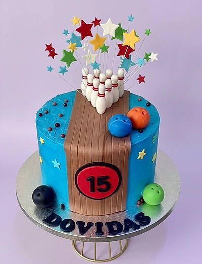 Blue bowling themed birthday cake with a wooden lane design, bowling pins, colorful balls, and star decorations.