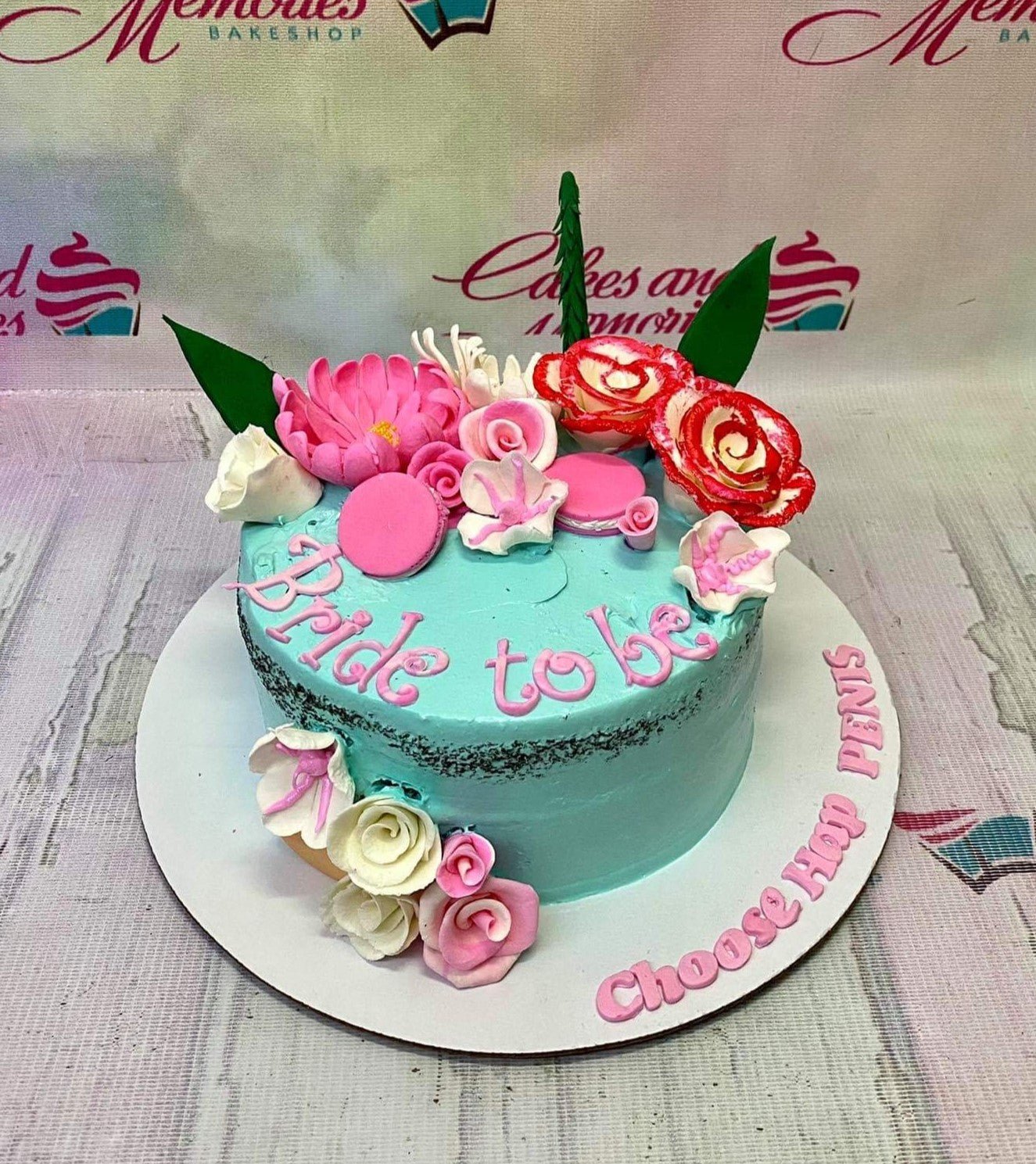 Teal blue single tier cake decorated with pink and white edible flowers, macarons, and a 'Bride to be' message.