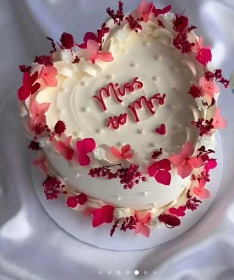 Heart-shaped white cake with pink and red dried flowers and 'Miss to Mrs' red icing message.