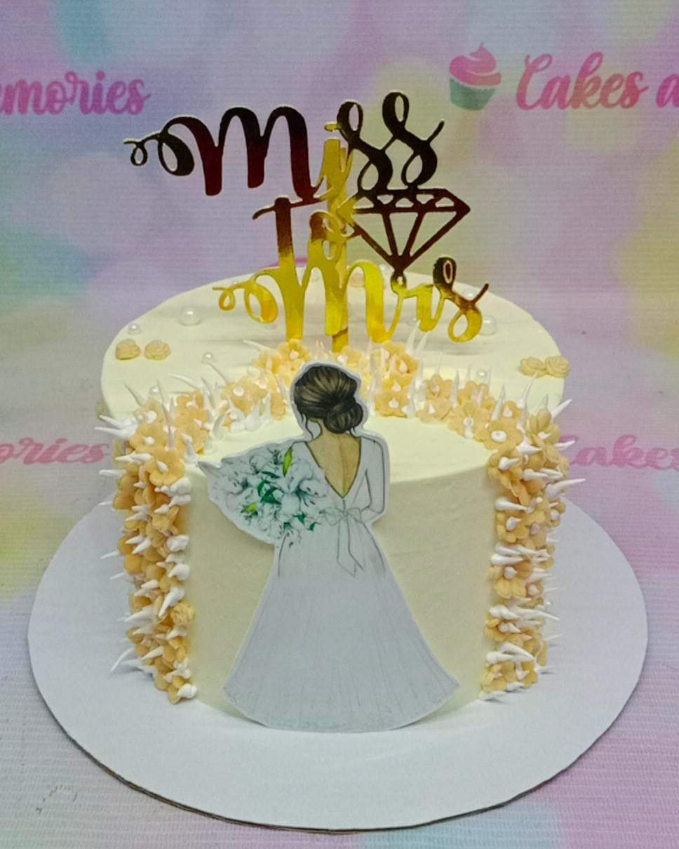 White minimalist bridal shower cake with a bride printout topper, gold Miss to Mrs topper, and yellow icing flower cascades.