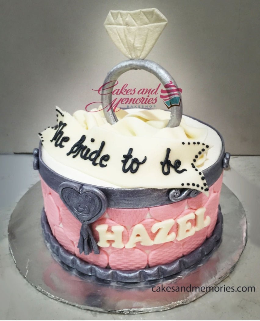 Pink fondant bridal shower cake with a large silver diamond ring topper and 'The Bride to be' banner.