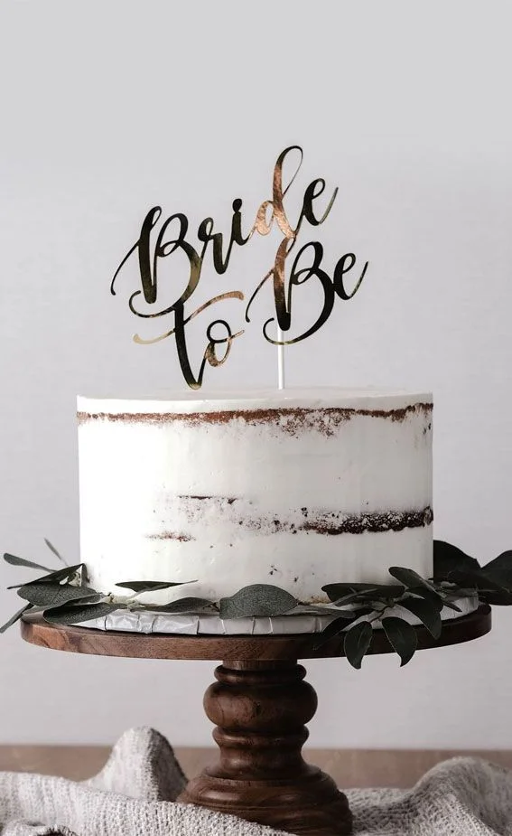 Semi-naked rustic white cake with a gold Bride to Be topper and green leaf accents on a wooden stand.
