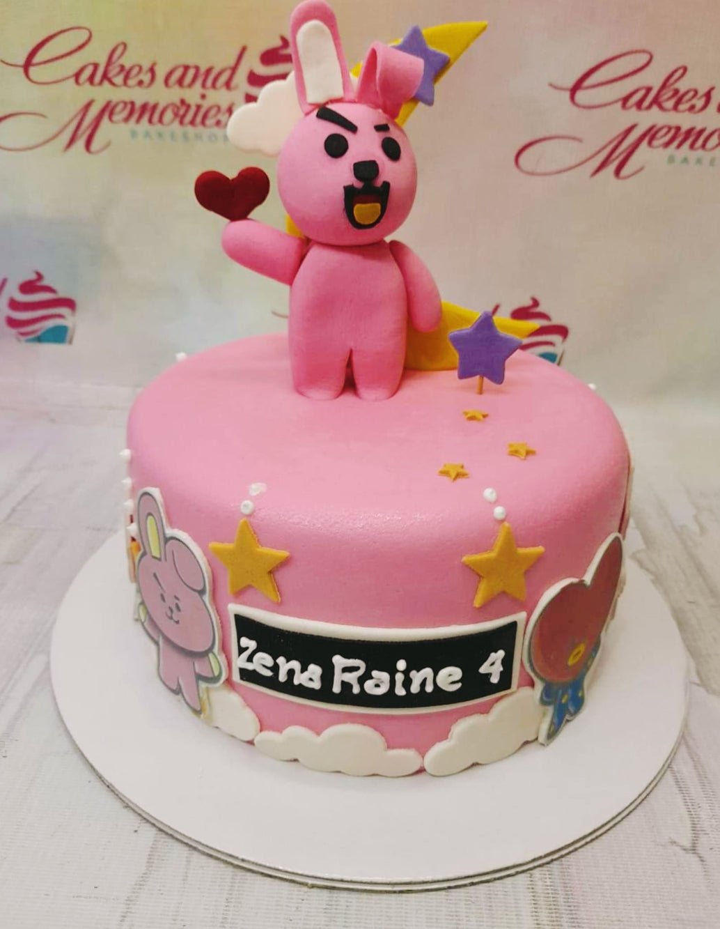 Pink fondant BT21 Cooky themed cake with a 3D pink bunny figure, yellow stars, and a name banner.