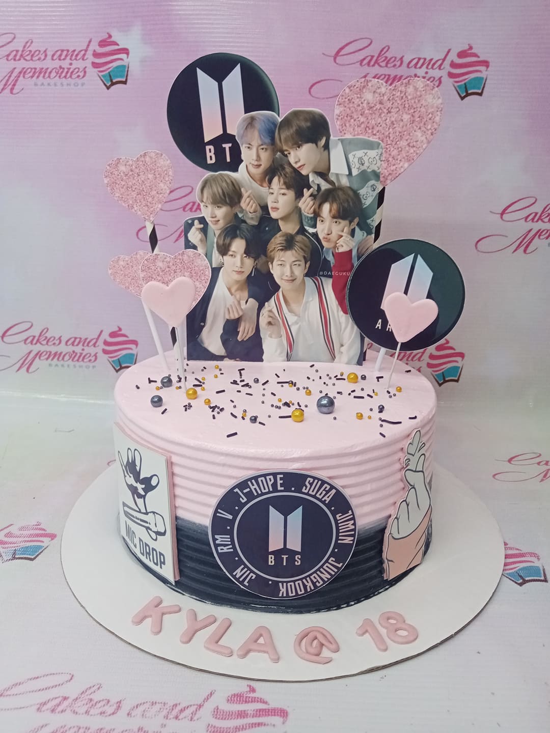 Pink and black BTS themed birthday cake with K-pop group printouts, glitter hearts, and sprinkles for an 18th birthday celebration.