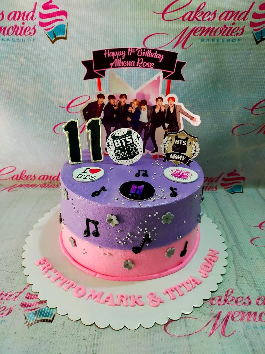 Purple and pink gradient BTS themed birthday cake with music notes, silver dragees, and character printouts.