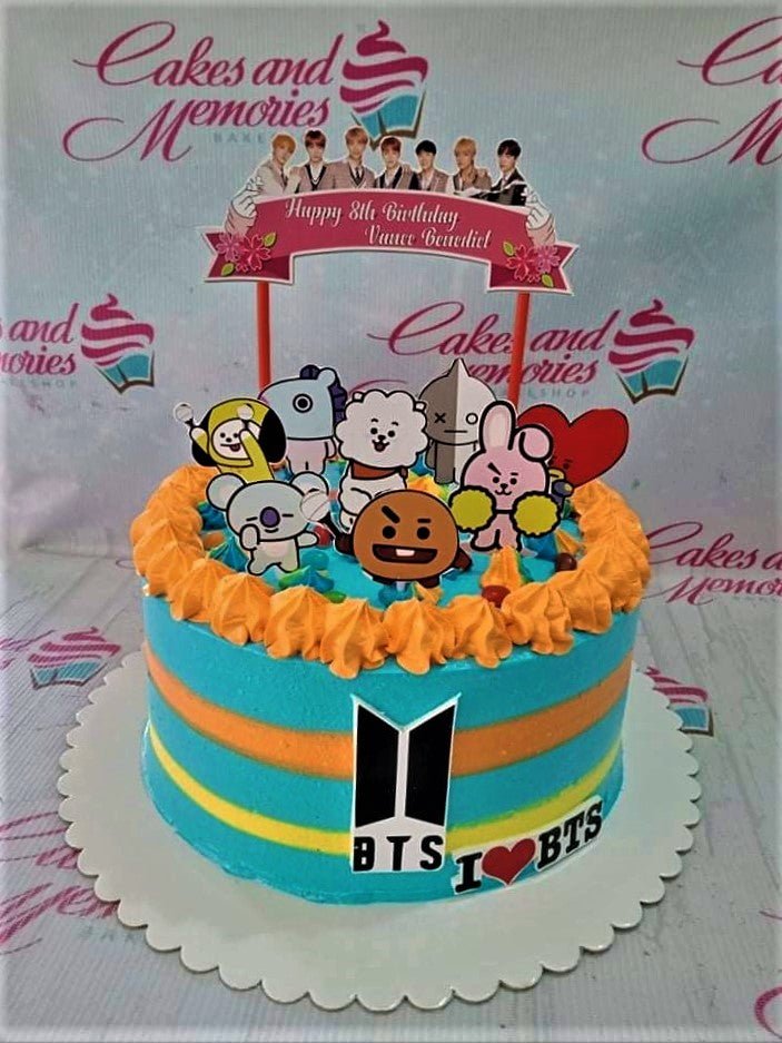Blue and orange BTS themed birthday cake with BT21 character toppers and a BTS logo on the side.